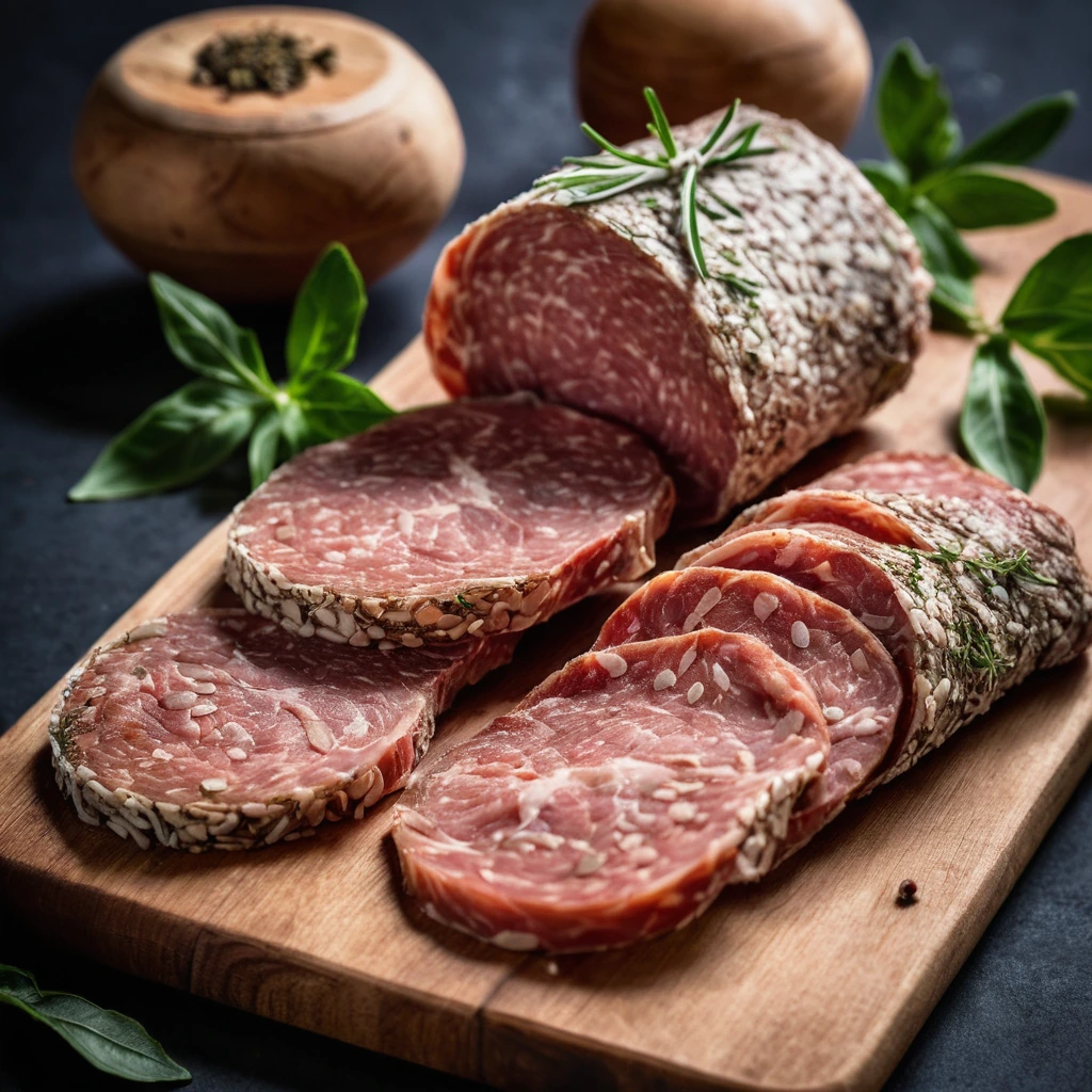 Soppressata is a traditional Italian cured sausage known for its robust and savory flavor. Originating from Southern Italy, particularly the regions of Calabria and Basilicata, it is made from coarsely ground pork seasoned with garlic, chili peppers, and fennel seeds. The flavor profile is bold and spicy with a slight tang from fermentation, offering a delightful complexity. Its texture is firm yet slightly yielding, making it ideal for slicing. When cooked, soppressata can become crispy and is often used to add depth and richness to dishes. Its versatility in both raw and cooked applications makes it a favorite in Italian cuisine and beyond.