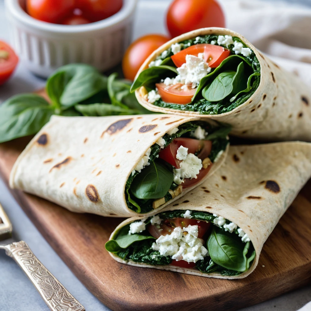 These wraps are packed with melty feta, juicy tomatoes, and fresh spinach, all wrapped up in a warm tortilla for a hearty start to your day.