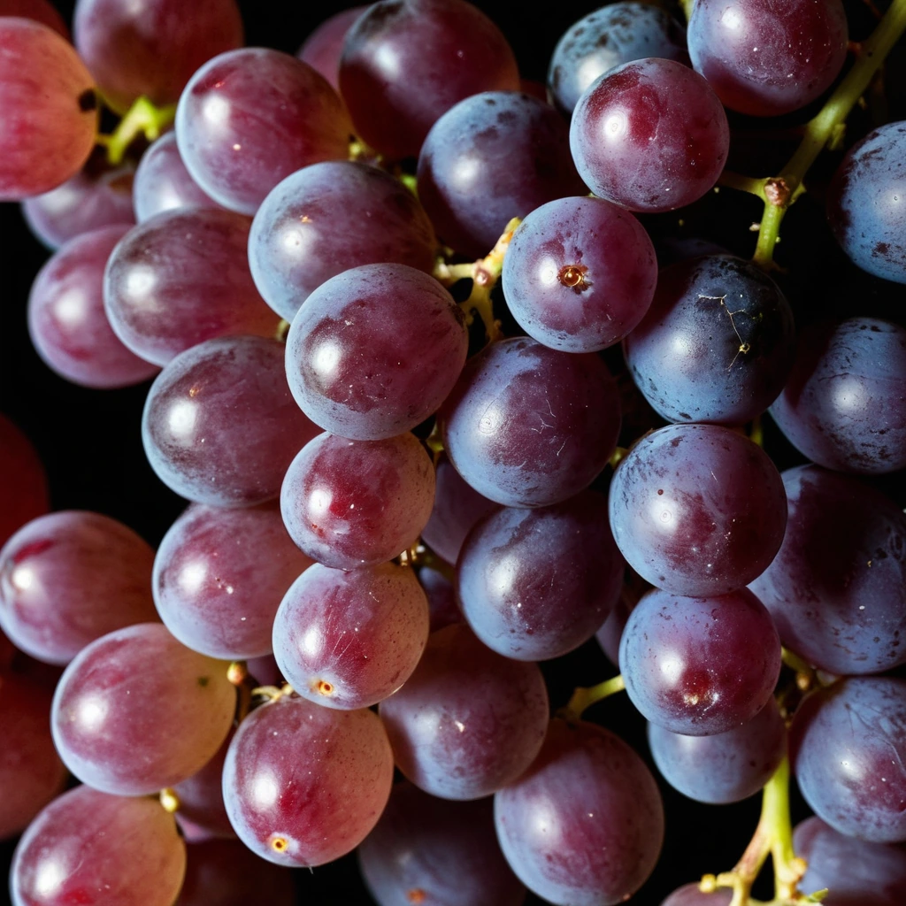 Grapes are small, round fruits that grow in clusters on vines, primarily cultivated in temperate zones around the world. Originating from the Near East, they have been cultivated for thousands of years and are integral to many cuisines and cultures, notably in winemaking. Grapes come in a variety of colors including green, red, purple, and black, each offering a unique flavor profile. They are known for their sweet yet slightly tart taste, with a pleasant, fruity aroma. Their texture is firm yet yielding, with a satisfying pop when bitten into, and they house a small, crunchy seed in many varieties, though seedless types are commonly found in markets. In cooking, grapes can be used fresh or dried, and they behave well in both sweet and savory dishes, contributing natural sweetness and vibrant color.