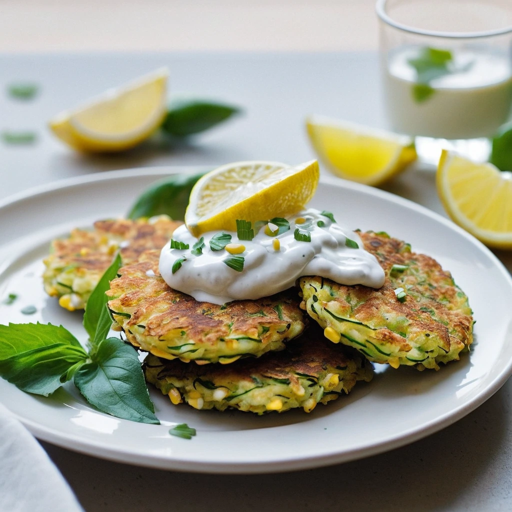 Golden, crispy fritters bursting with fresh zucchini and sweet corn, served with a tangy lemon yogurt drizzle.