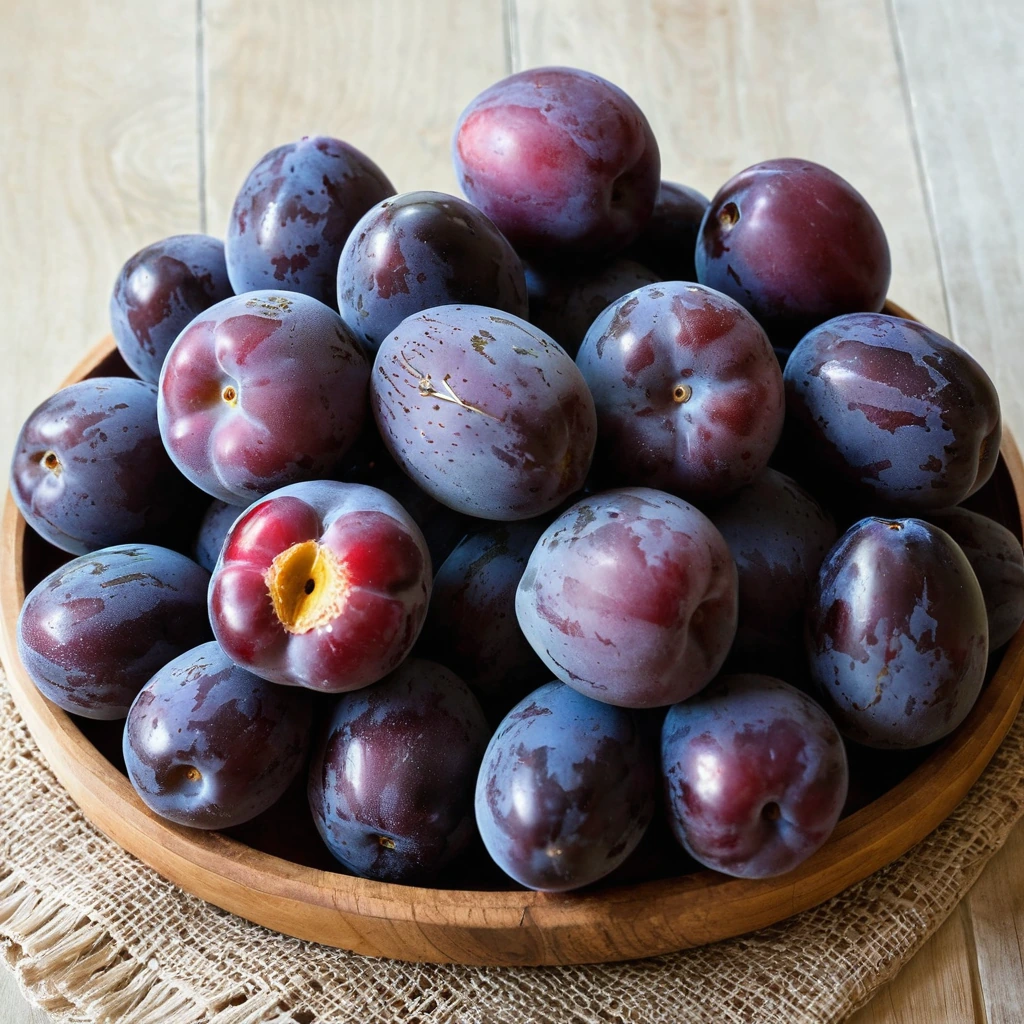 Plums are a species of fruit belonging to the genus Prunus, which also includes peaches, nectarines, and cherries. Originating in China and cultivated for thousands of years, plums have become a staple in many cuisines worldwide. They boast a flavor profile that is both sweet and tangy, with a subtle floral aroma that enhances their appeal. The texture of a ripe plum is juicy and tender, with a smooth skin and firm flesh that gives way to a central pit. In cooking, plums can be used fresh, dried, or cooked down into preserves. They behave well in both sweet and savory dishes, releasing their juices when cooked to create rich sauces or compotes.