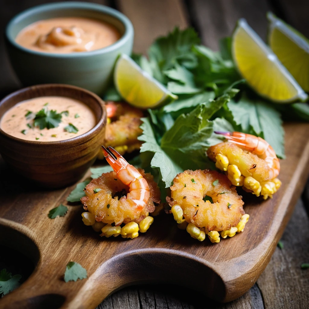 Crispy on the outside, tender on the inside, these golden fritters pack a punch with juicy shrimp and sweet corn, all topped with a zesty chili aioli.