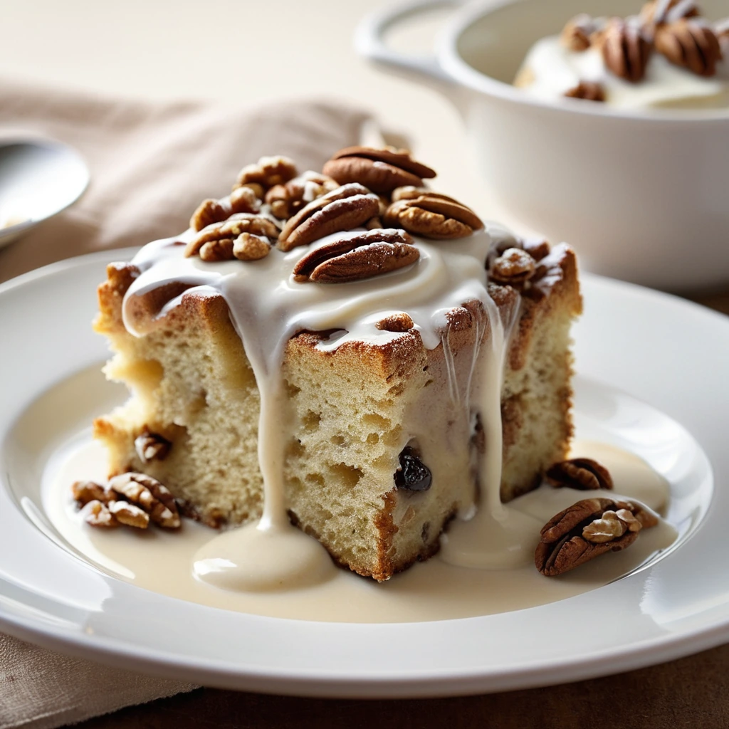 Warm, spiced bread pudding drizzled with maple syrup and crunchy pecans, served with a silky vanilla sauce.