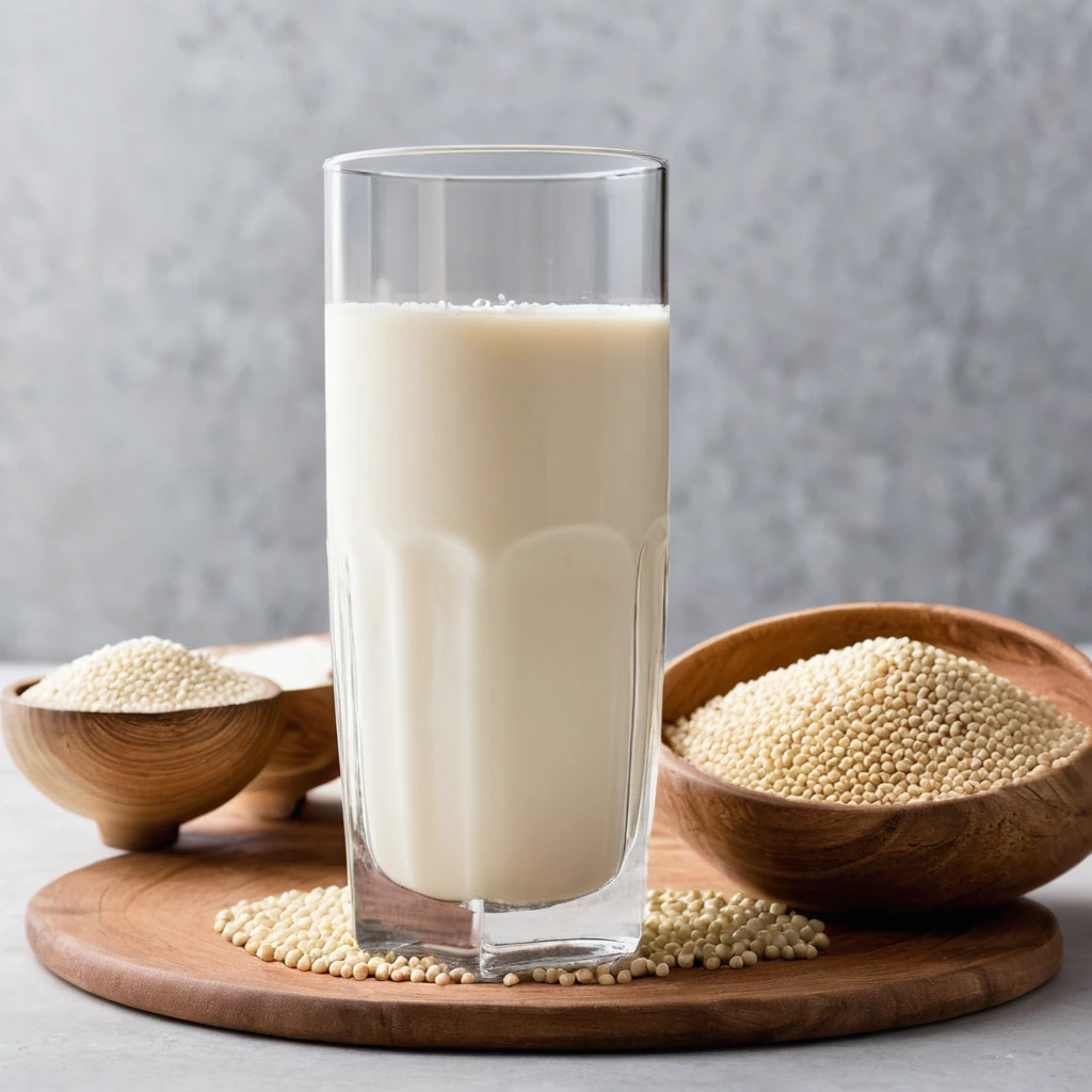 Soy milk is a plant-based beverage made from soaking, grinding, and boiling soybeans. Originating in East Asia, it has been consumed for centuries, particularly in China. Its flavor is mild and slightly nutty, with a subtle sweetness that varies depending on the brand and whether it is sweetened. The texture is smooth and creamy, often comparable to dairy milk, though it can sometimes have a slightly grainy or beany aftertaste if not processed well. Soy milk performs well in cooking and baking, as it can froth like dairy milk for lattes, and its high protein content helps provide structure in recipes. It is a versatile ingredient that can be used in everything from smoothies to soups.