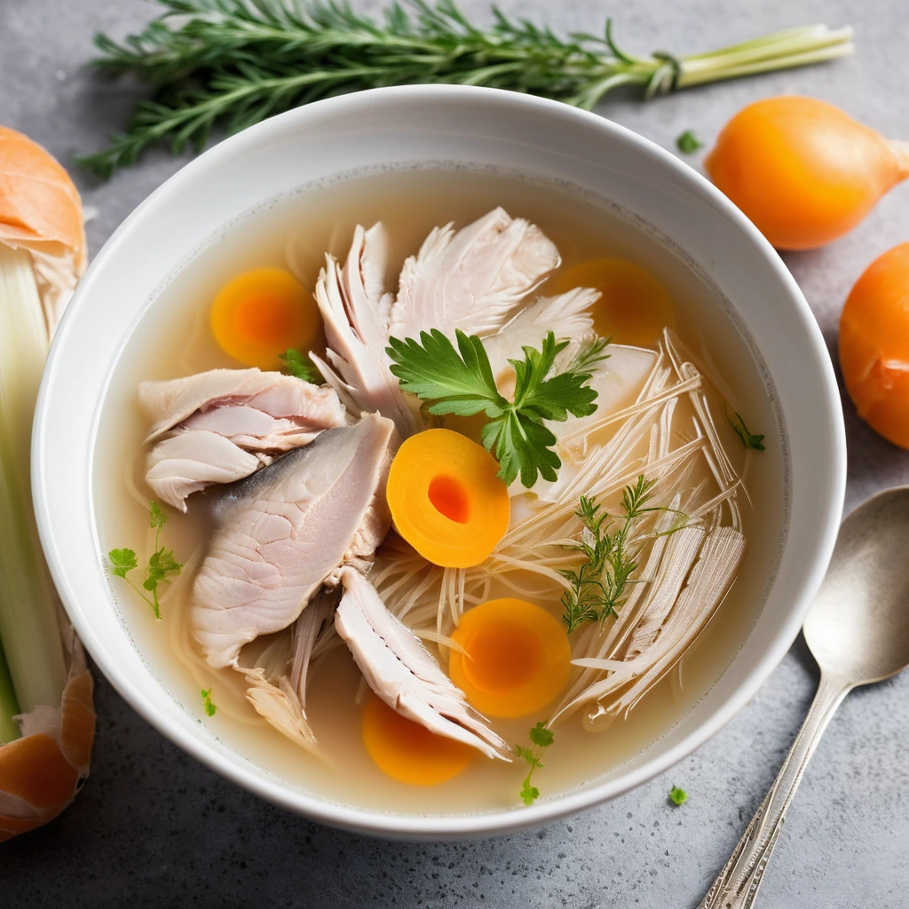 A fragrant, golden liquid brimming with the savory essence of simmered chicken bones and aromatic vegetables, offering a rich, comforting base for countless dishes.
