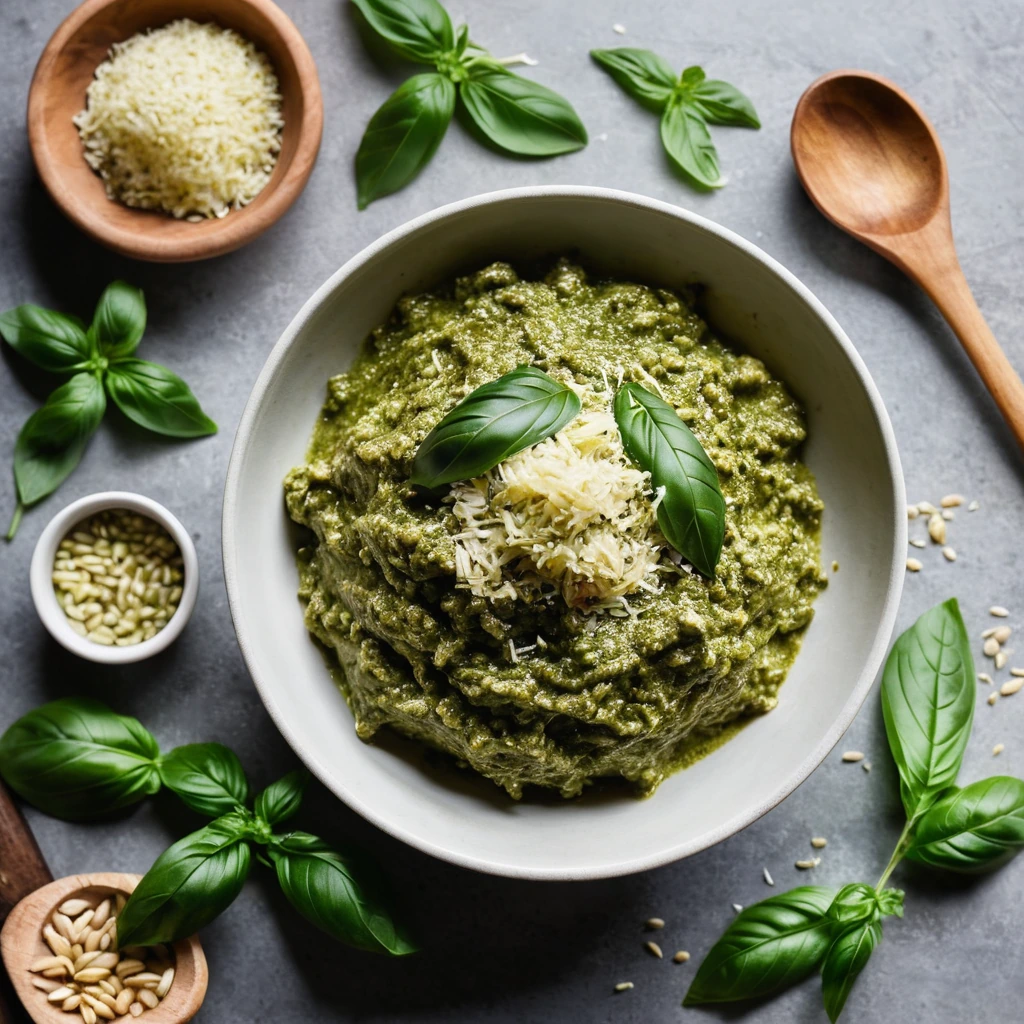 A vibrant, herbaceous sauce bursting with the fresh flavors of basil, garlic, pine nuts, Parmesan cheese, and olive oil. Each spoonful delivers a fragrant, slightly nutty, and tangy experience that's both comforting and invigorating.