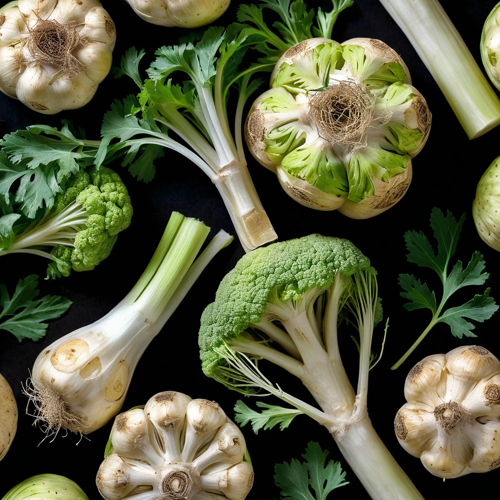 Celery root, also known as celeriac, is a bulbous vegetable related to celery and parsley. Originating in Europe and the Mediterranean, it has been a staple in European cuisine for centuries. Its flavor is earthy and nutty, reminiscent of both celery and parsley with a hint of parsley-like freshness. The texture is firm and starchy, similar to a potato, offering a satisfying crunch when raw and becoming tender and creamy when cooked. In cooking, celery root is versatile, holding its shape well in soups and stews while also being ideal for roasting, mashing, or grating into slaws. It absorbs flavors readily and contributes a unique depth to dishes without overpowering them.