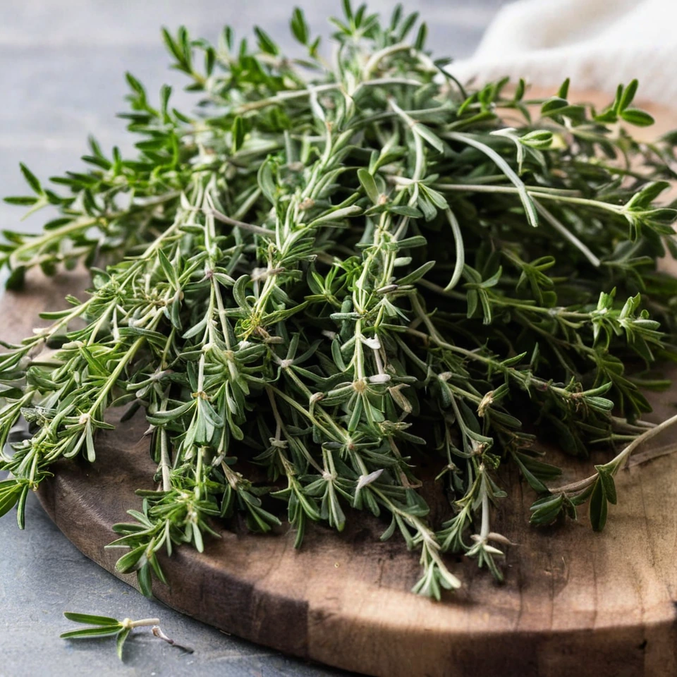 Fresh thyme is a fragrant herb with small, green, lemony leaves that add a subtle, earthy flavor to dishes. It's a staple in Mediterranean and French cuisines, known for its aromatic qualities and health benefits.