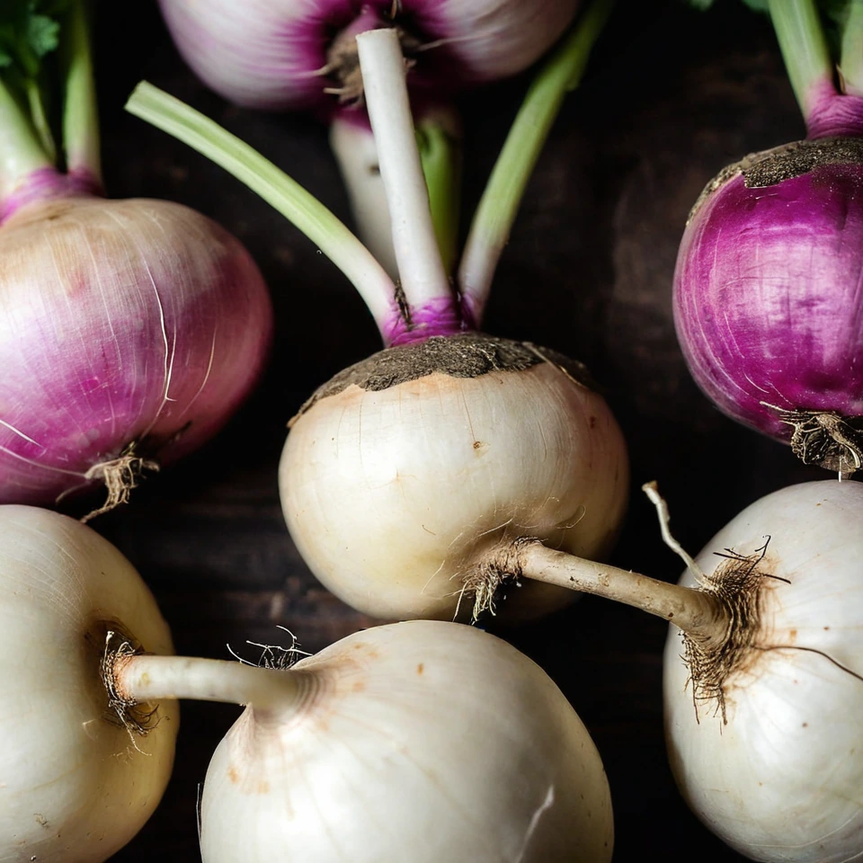 Turnips are root vegetables known for their slightly peppery and earthy flavor. They have a firm texture and can range in color from white to purple. Turnips are nutritious, offering a good source of vitamin C and fiber.
