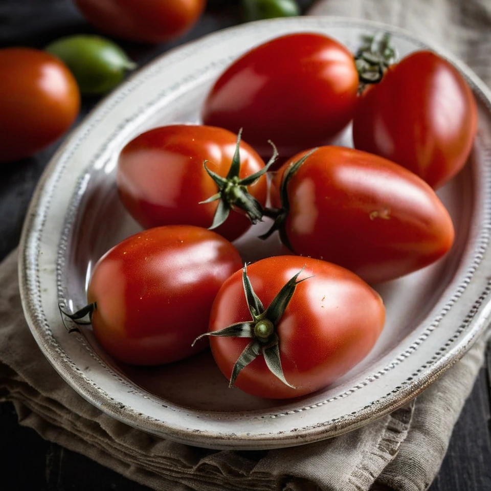Roma tomatoes are a variety of plum tomatoes known for their oval shape, thick flesh, and low seed count. They are celebrated for their rich, tangy flavor and meaty texture, making them ideal for cooking.