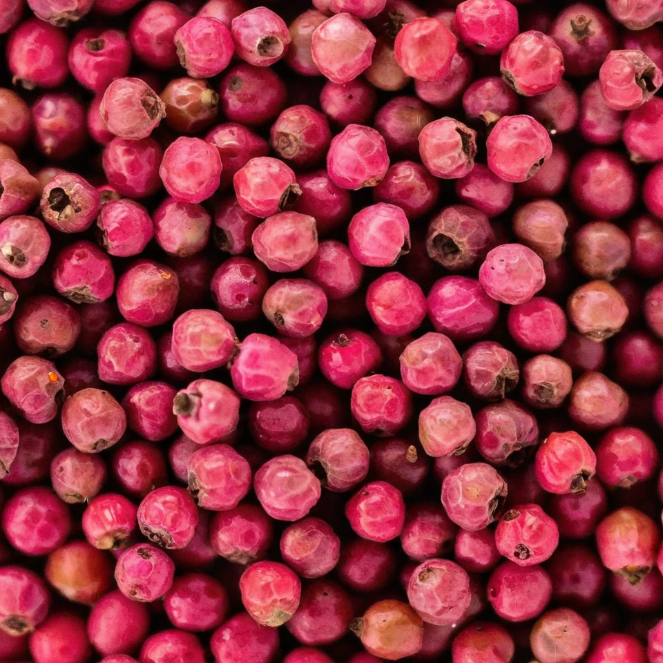 Pink peppercorns, though not true peppercorns, offer a delicate, sweet, and slightly floral flavor with a gentle heat that lingers. Their aroma is fresh and fruity, reminiscent of rose petals and citrus. The texture is firm yet yields a satisfying crunch when bitten into. Originating from the dried berries of the Baies roses tree in South America, they add a vibrant pop of color and a nuanced taste to dishes. Valued for their visual appeal and unique flavor profile, they elevate both sweet and savory dishes with a touch of sophistication.