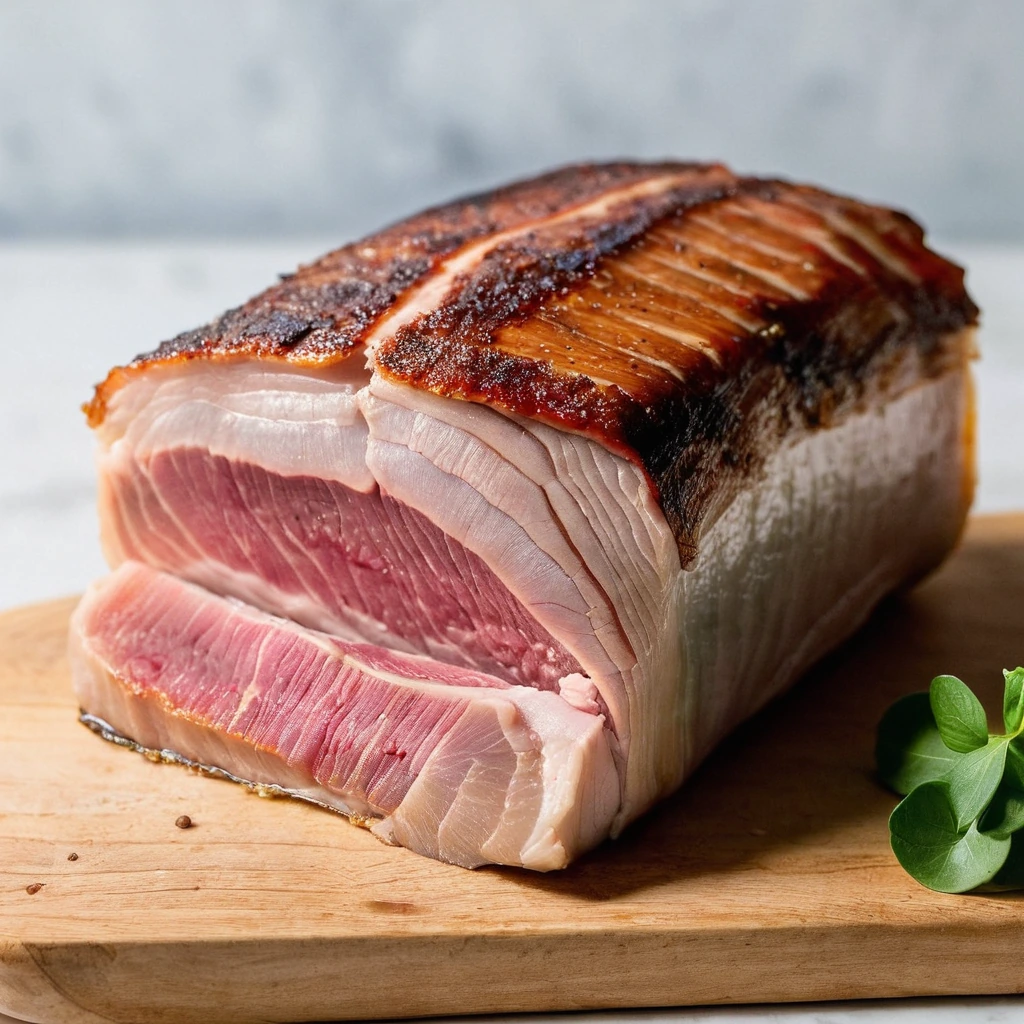 Pork belly is a cut of meat taken from the belly of a pig, known for its generous layers of fat and succulent meat. Originating from various culinary traditions around the world, it is particularly celebrated in Chinese cuisine, where it is often braised or roasted to crispy perfection. Pork belly boasts a rich, savory flavor profile with a satisfying fattiness that can be both sweet and salty. Its texture is luscious and tender when cooked properly, offering a melt-in-your-mouth experience. In cooking, pork belly behaves exceptionally well under slow roasting or braising, rendering its fat to create a crispy skin while maintaining a juicy interior. It is a versatile ingredient that can absorb and complement a wide range of seasonings and sauces.