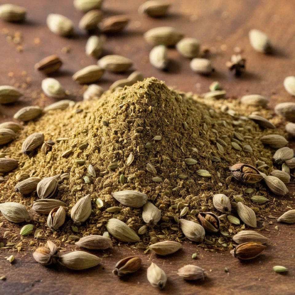 Ground cardamom is a fragrant and slightly spicy spice made from the seeds of the cardamom plant. It has a warm, citrusy, and floral flavor that adds depth to both sweet and savory dishes.