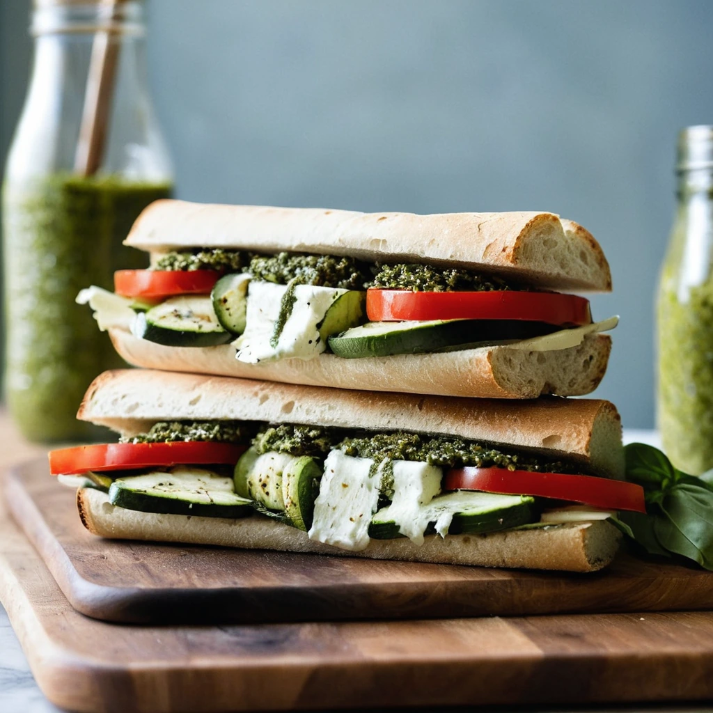 Warm, toasty ciabatta cradles a medley of roasted veggies, vibrant pesto, and melty mozzarella for a sandwich that's as hearty as it is fresh.