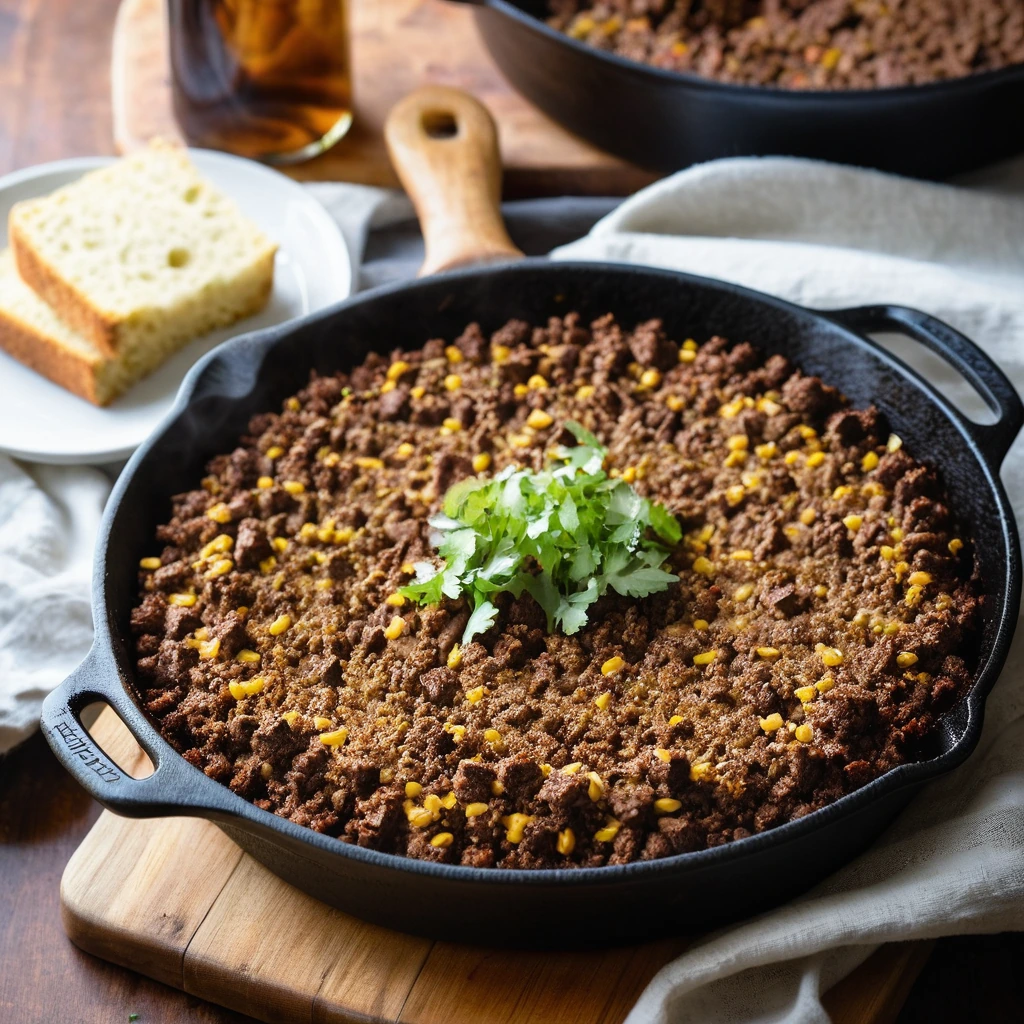 Imagine the rich smokiness of BBQ sauce mingling with tender ground beef atop golden, crumbly cornbread in a skillet.